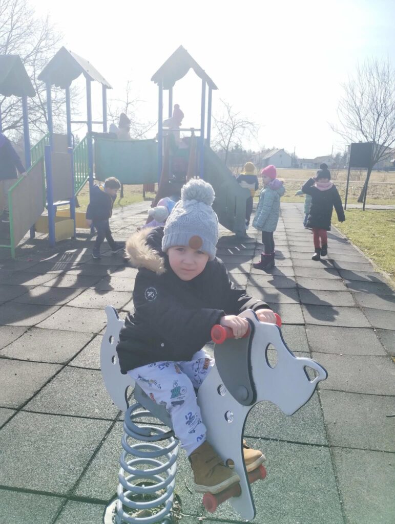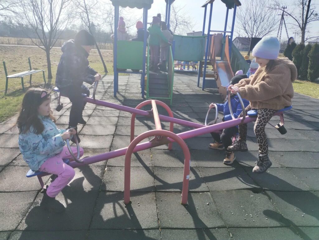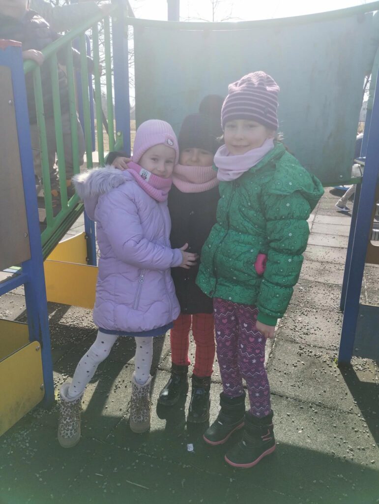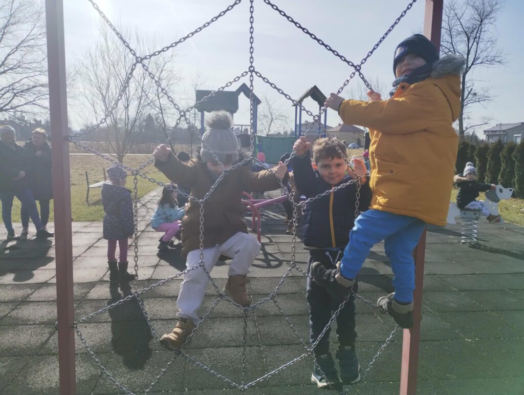 Czekając niecierpliwie na wiosnę korzystamy też z pierwszych promieni słonecznych, wychodząc na podwórko przedszkolne.