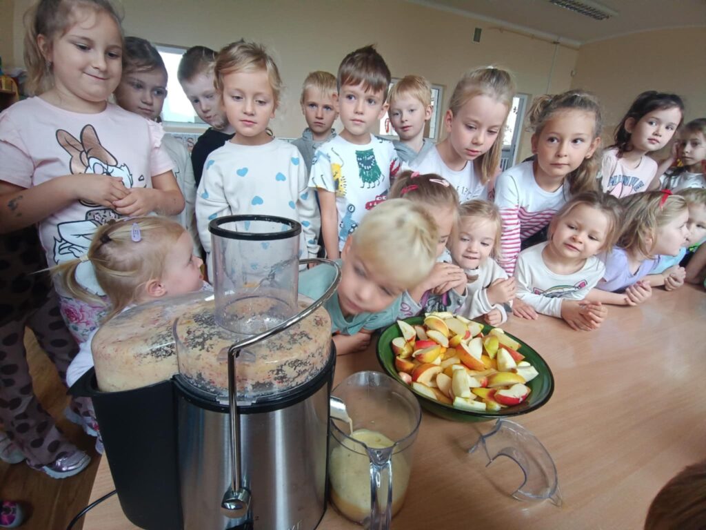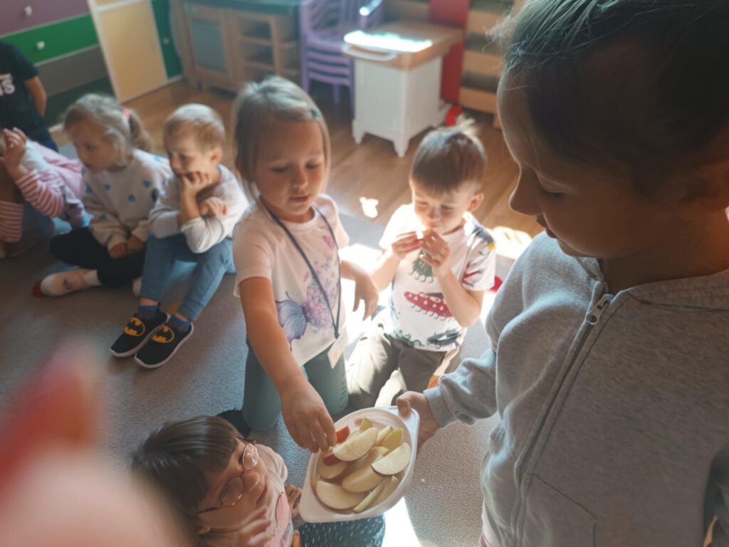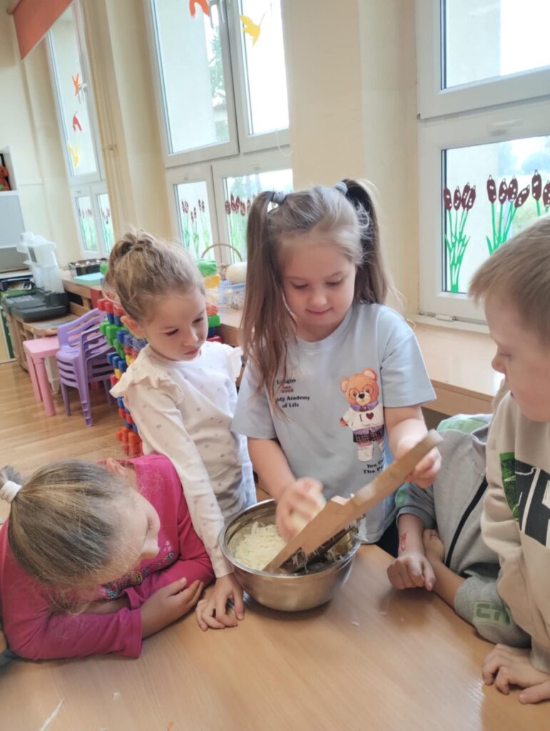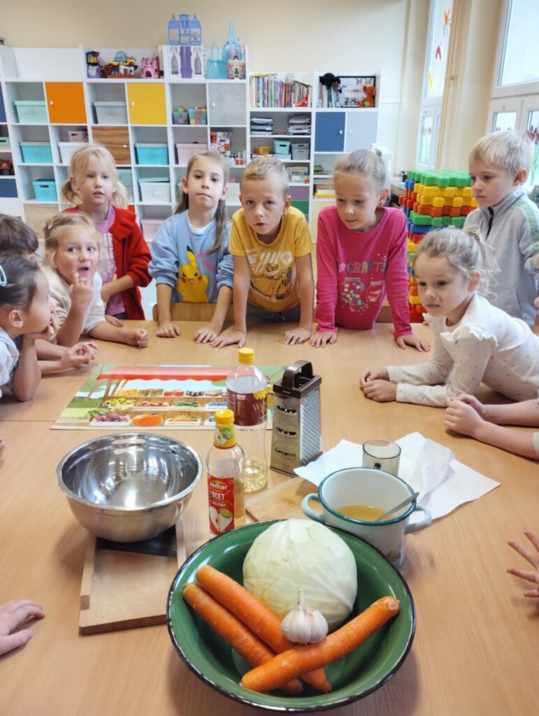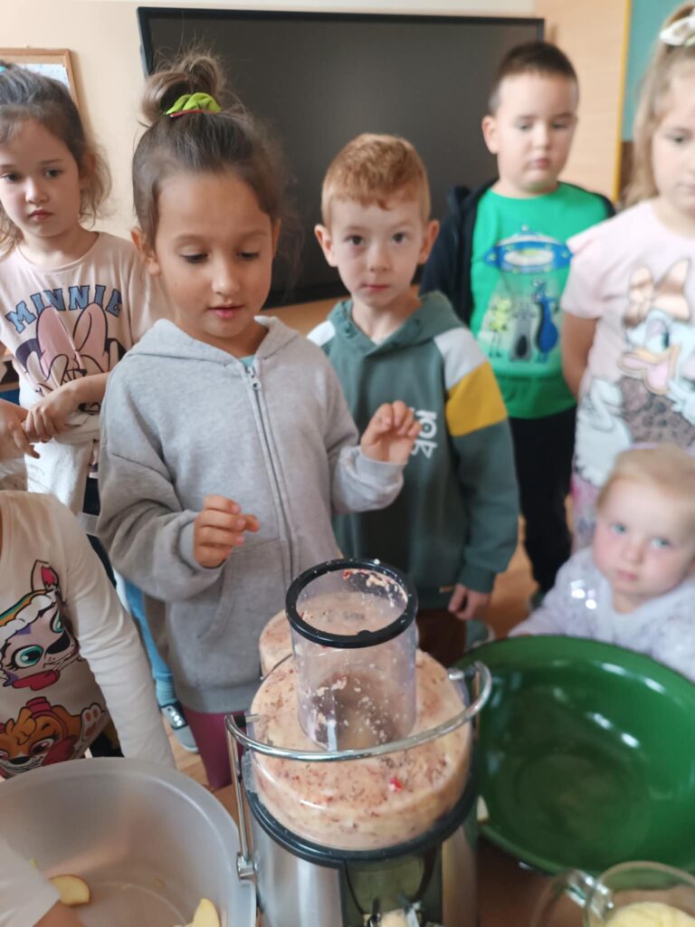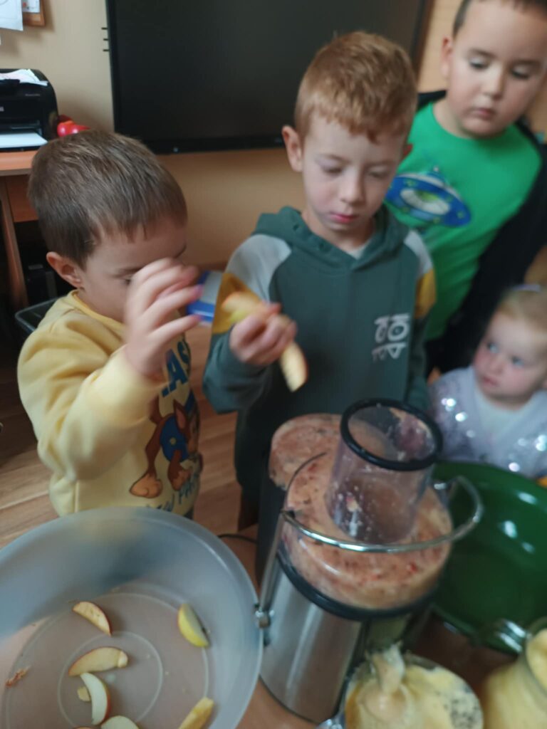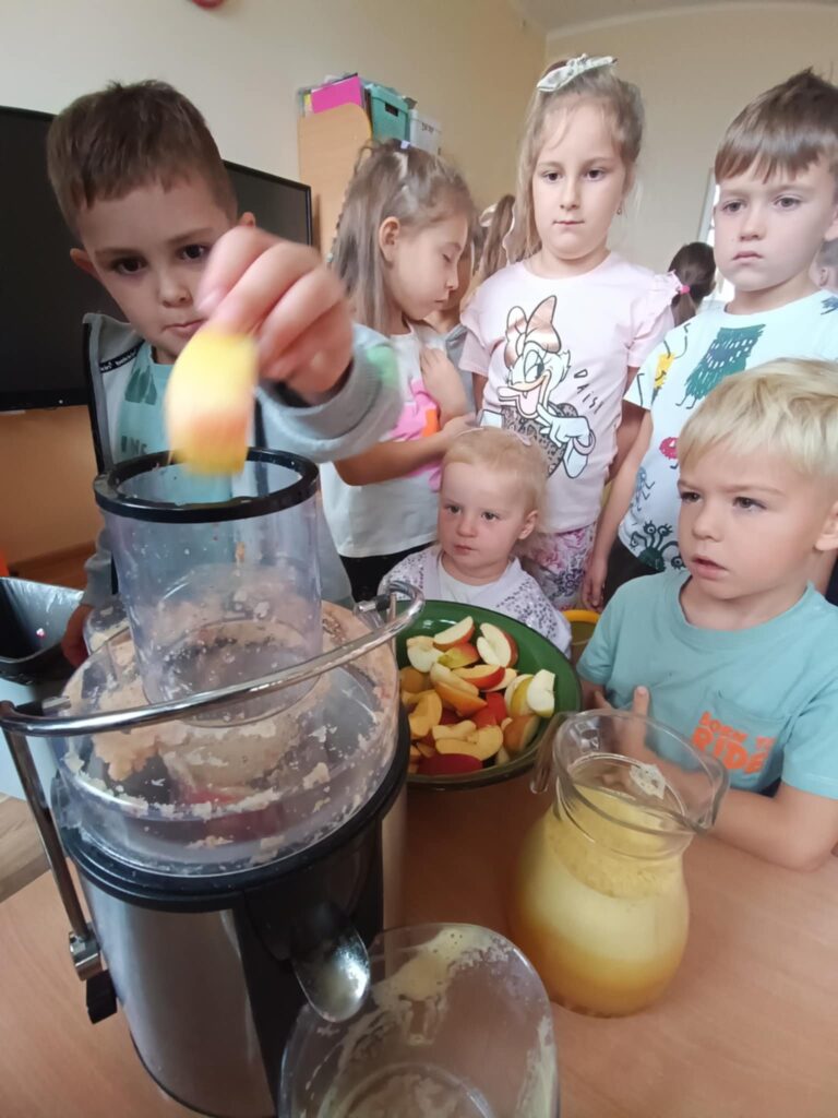 W tym tygodniu przedszkolaki poznawały dary jesieni z sadu i ogrodu, nazywały je i smakowały. Dzieci zrobiły sok jabłkowy, upiekły pyszne jabłkowe babeczki i samodzielnie wykonały surówkę z białej kapusty.