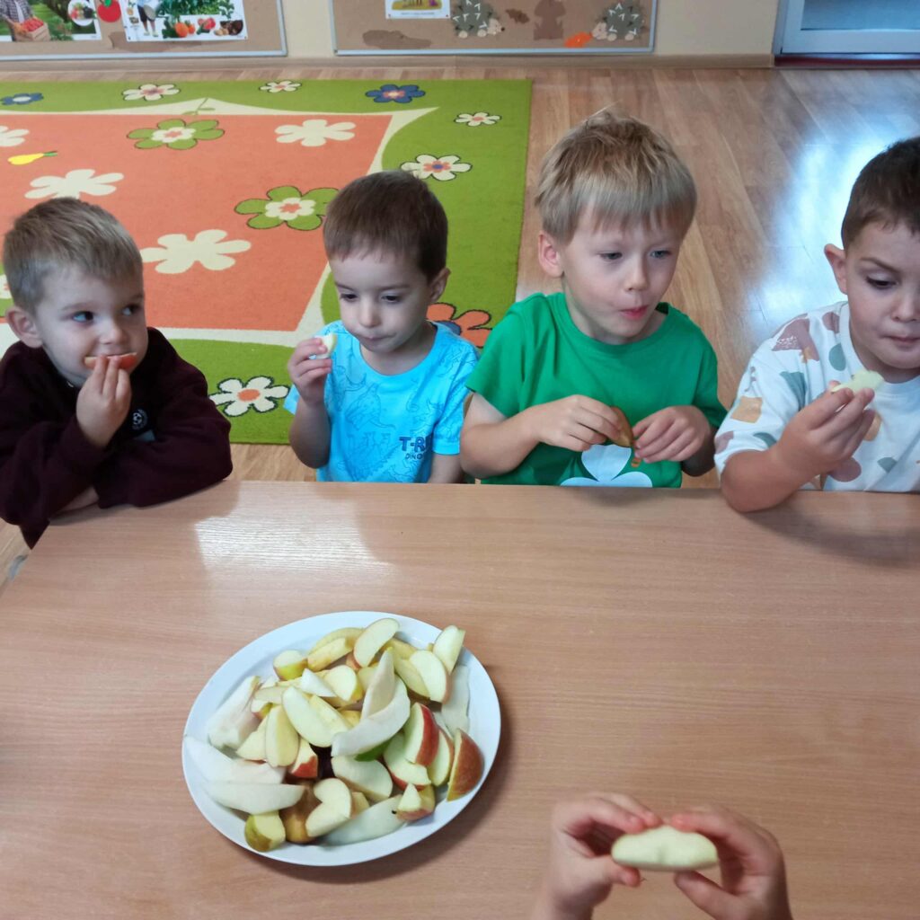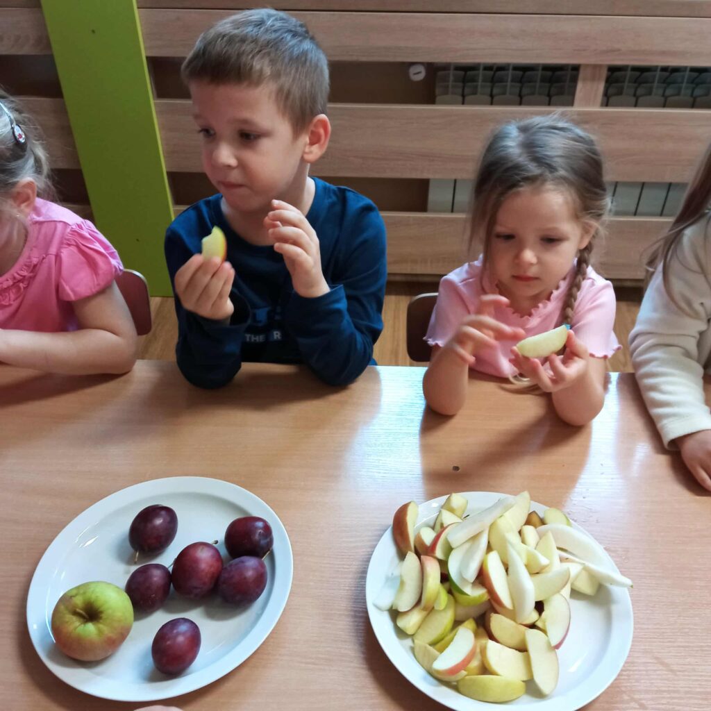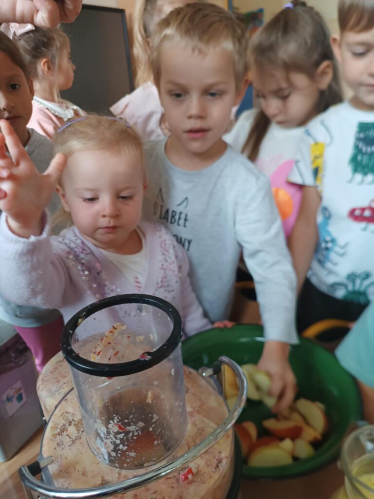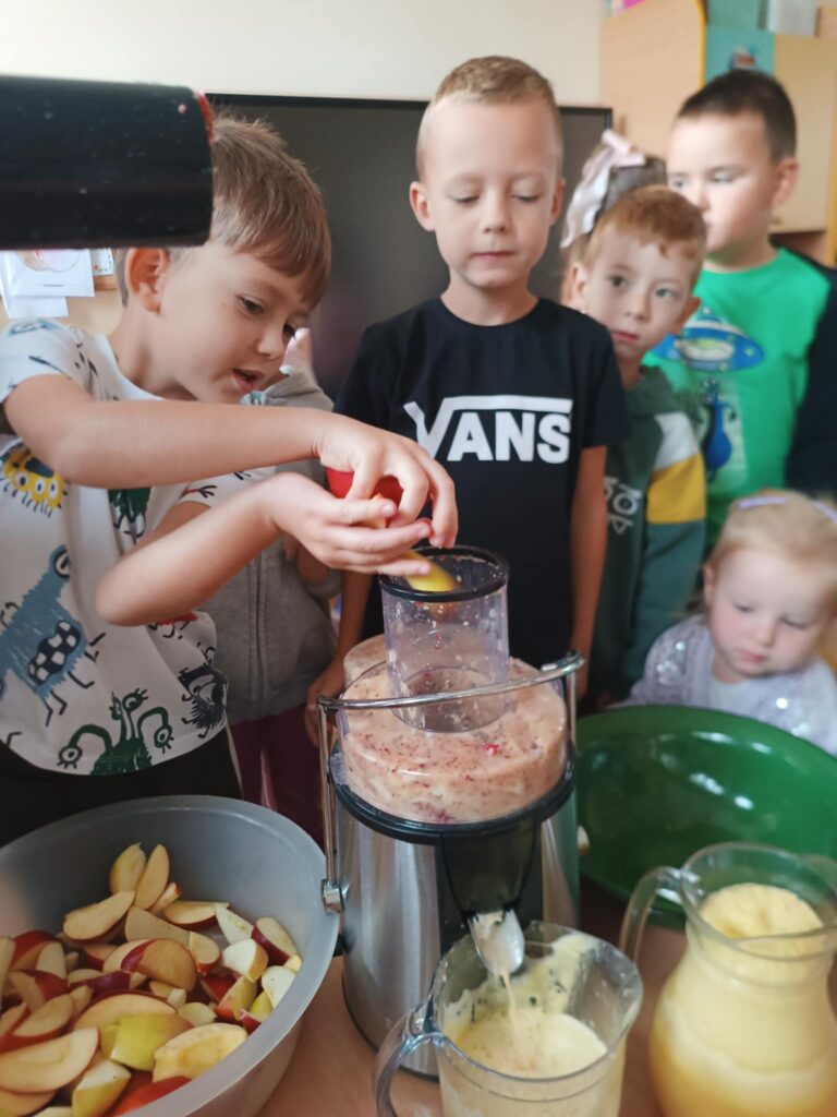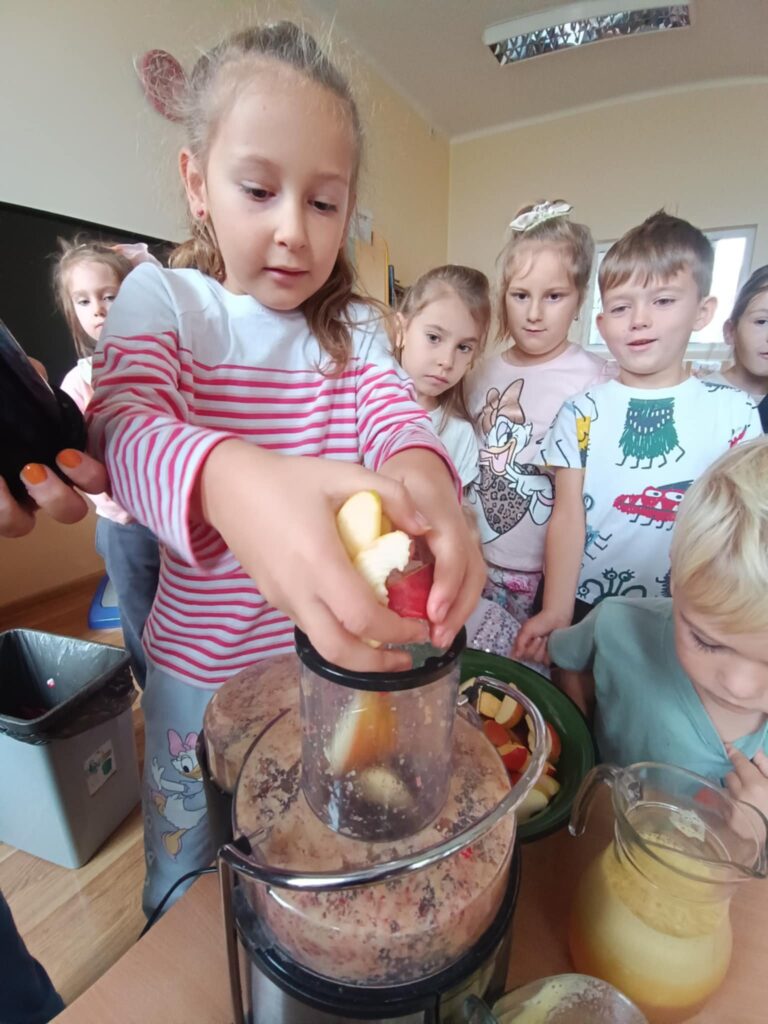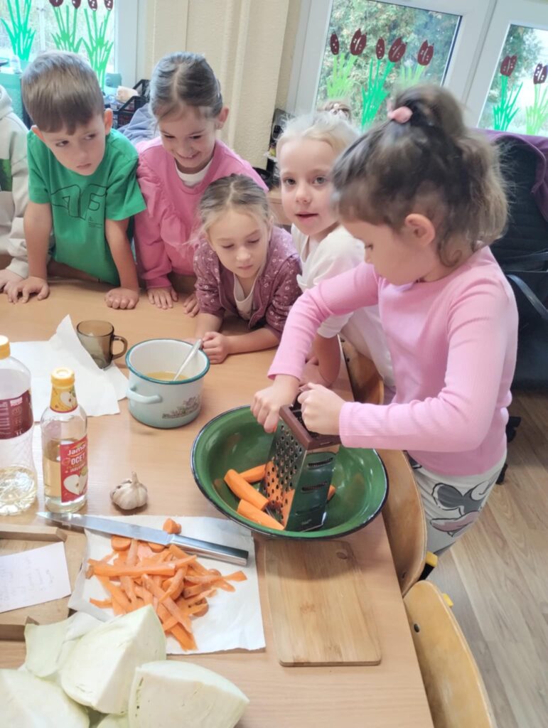 W tym tygodniu przedszkolaki poznawały dary jesieni z sadu i ogrodu, nazywały je i smakowały. Dzieci zrobiły sok jabłkowy, upiekły pyszne jabłkowe babeczki i samodzielnie wykonały surówkę z białej kapusty.