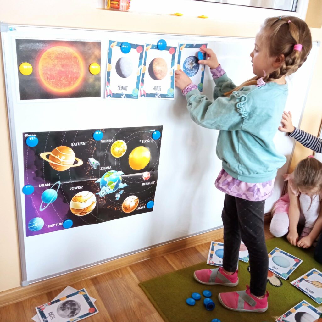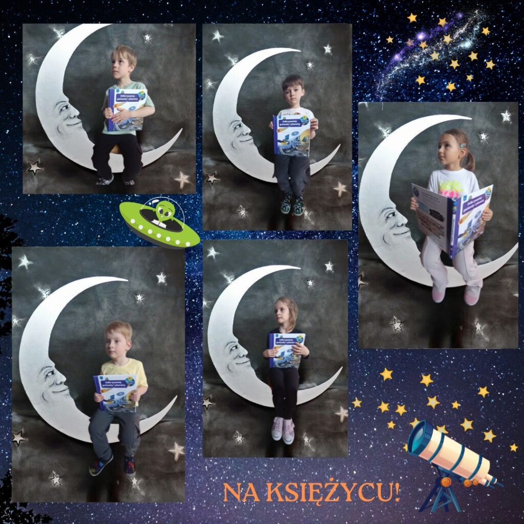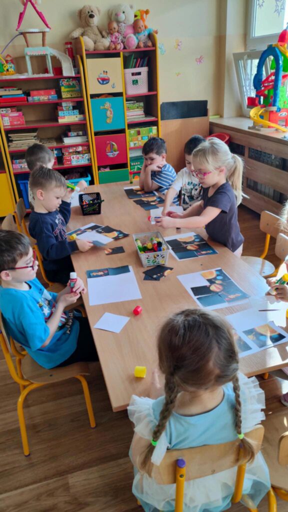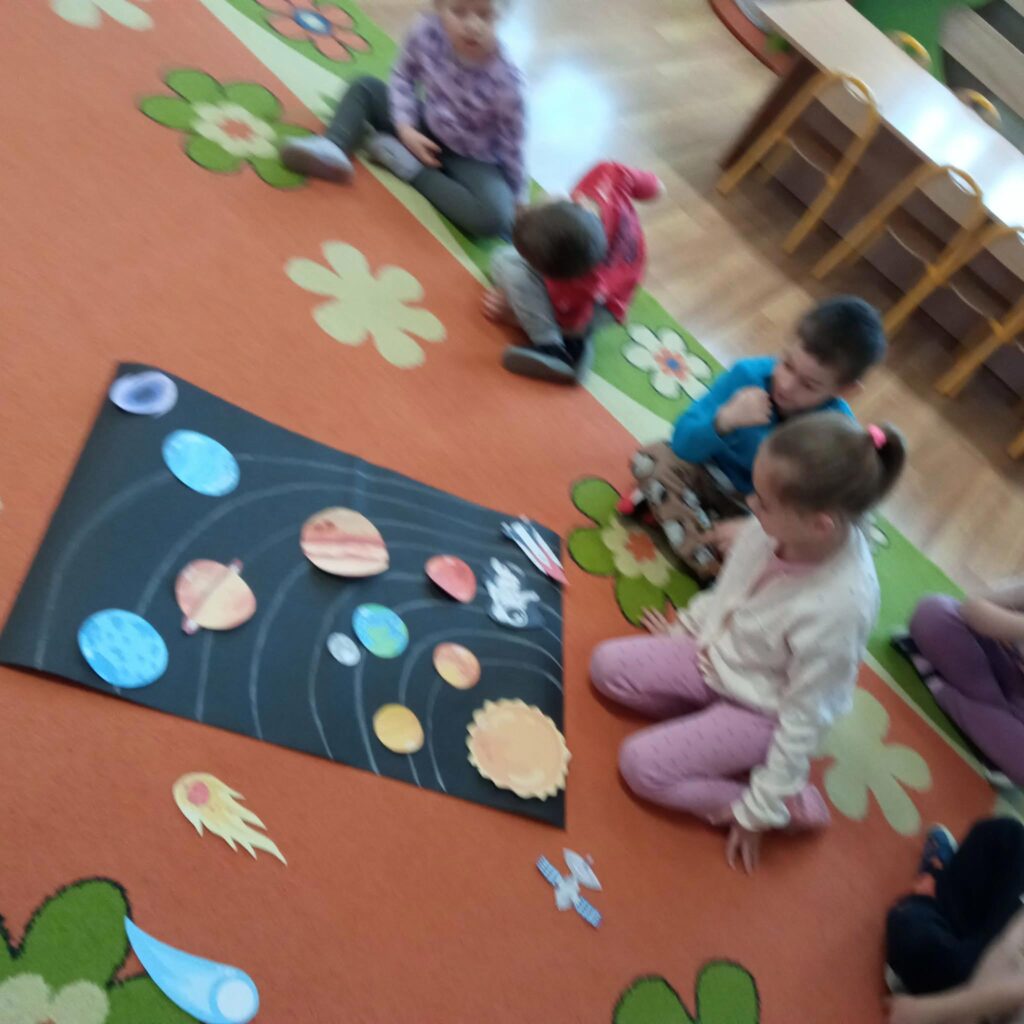 W tym tygodniu przedszkolaki utrwalały znajomość nazw planet Układu Słonecznego, poznały pojęcia związane z kosmosem (np. łazik, astronauta, Droga Mleczna itp.). Wykonały też ciekawe prace plastyczne i obejrzały ciekawy program popularnonaukowy o zjawisku występowania dnia i nocy.