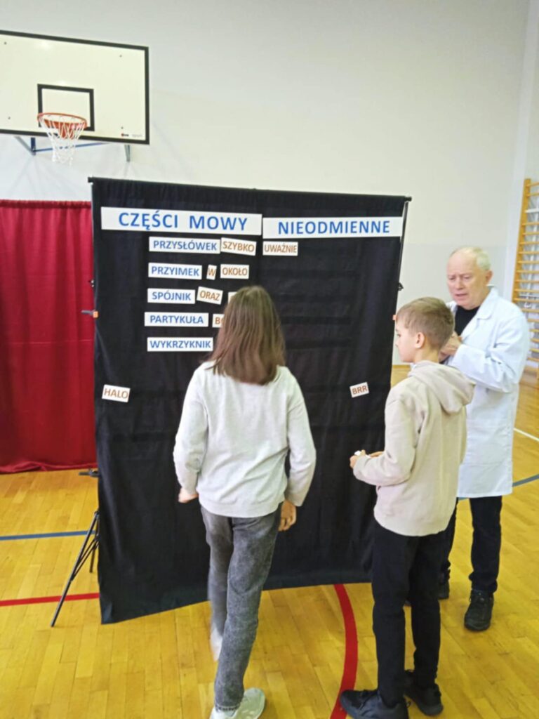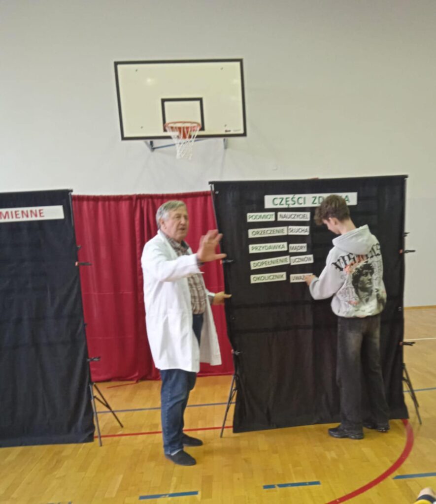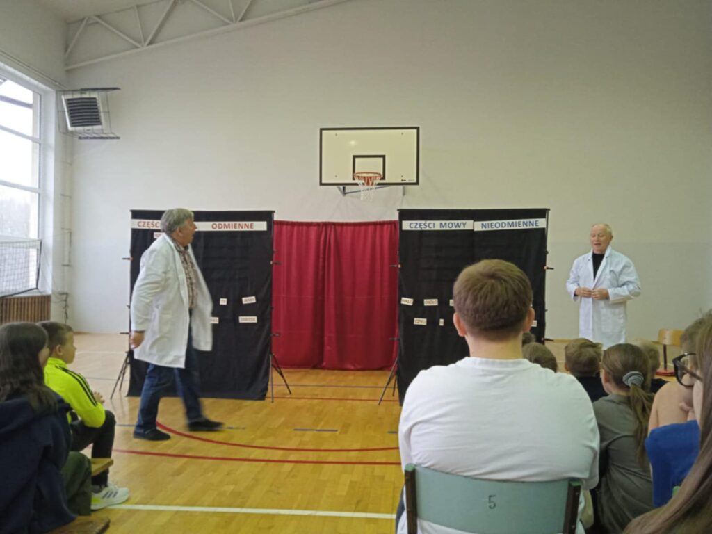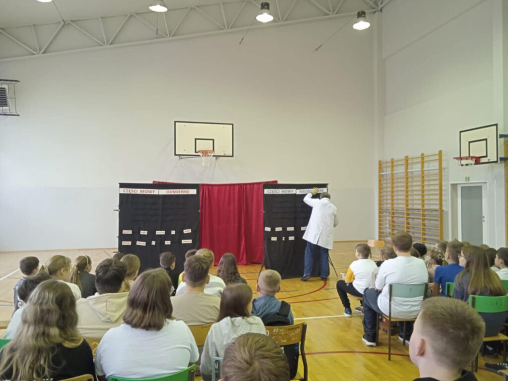 Tematem były części mowy i części zdania. I myli się ten, kto myśli, że przedstawienie było nudne. Okazuje się, że można w zabawny sposób przedstawić wiadomości na temat rzeczownika, przysłówka czy liczebnika. Uczniowie mogli też wysłuchać nienagannej recytacji ciekawy utworów poetyckich. Na zakończenie chętnie osoby pojawiły się na scenie i rozpoznawały części mowy i części zdania.