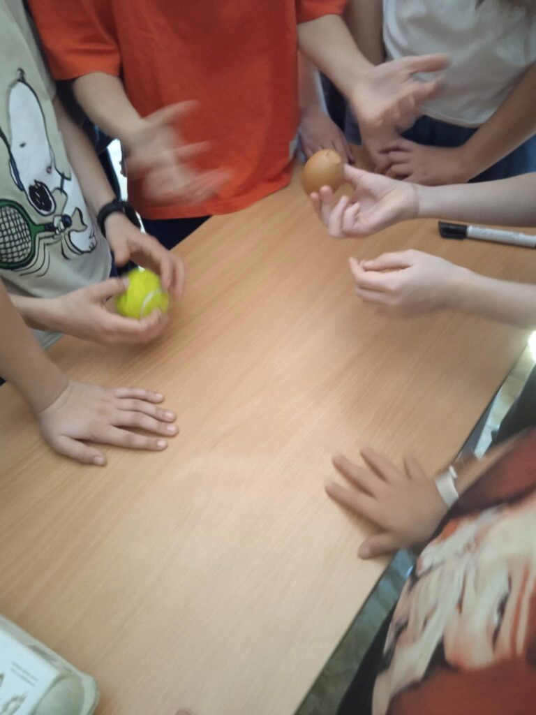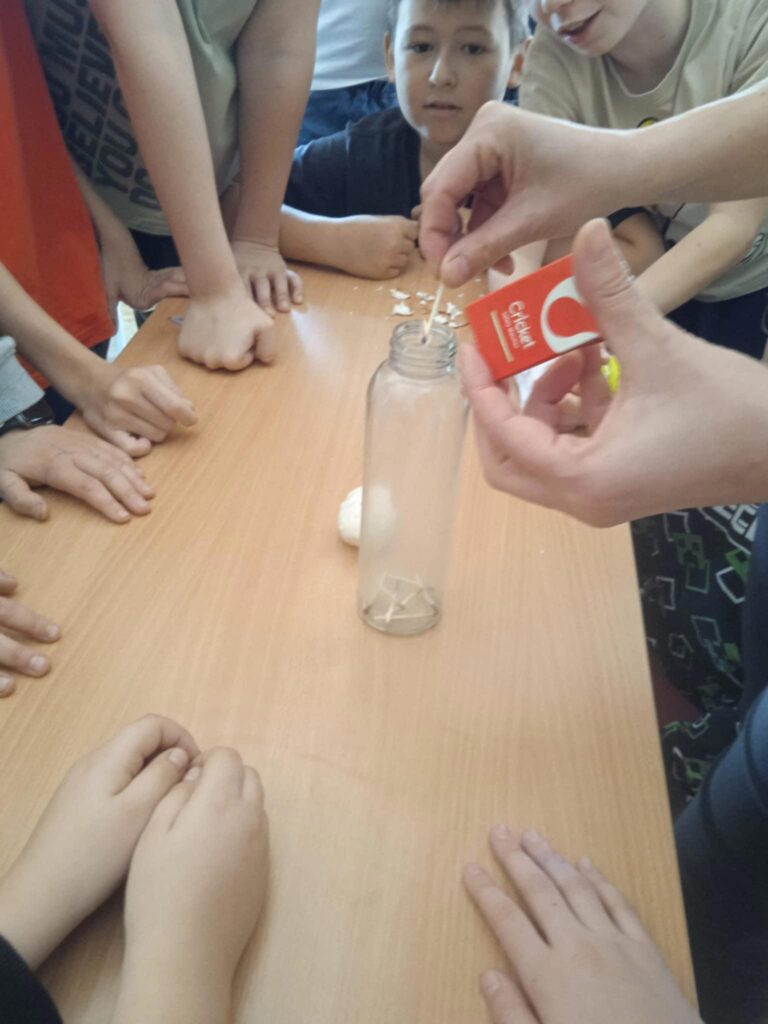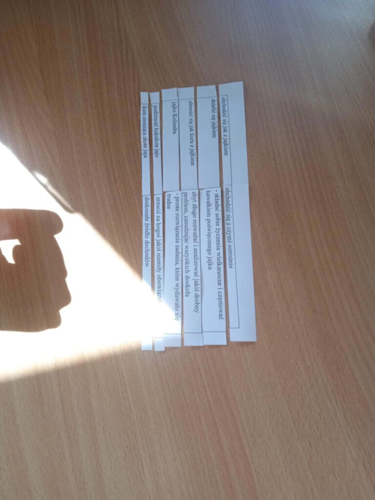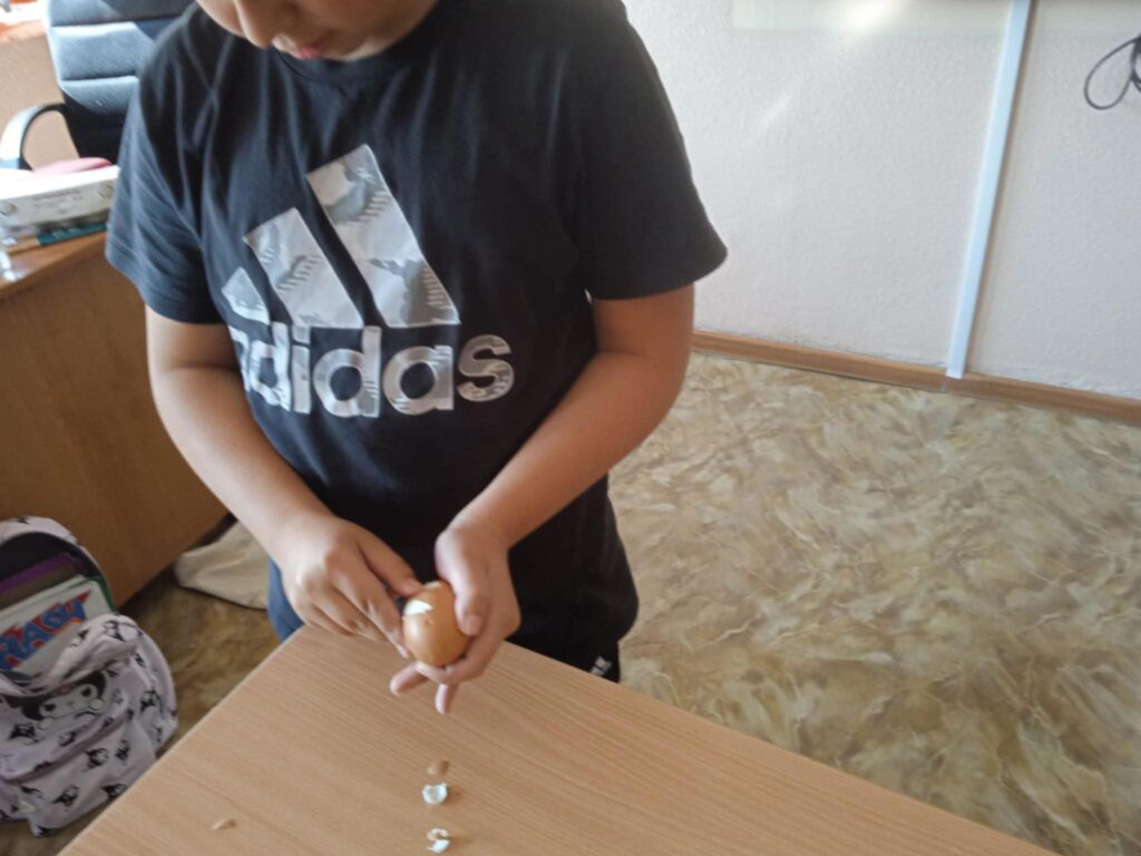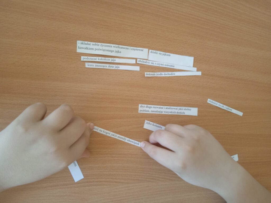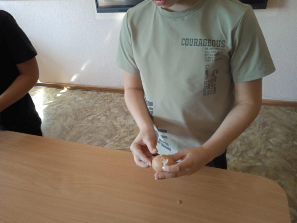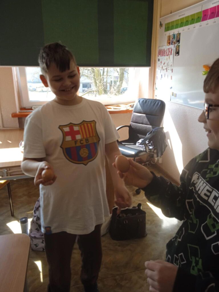 Zapoznawaliśmy się z frazeologizmami związanymi z jajkiem. Przeprowadziliśmy także kilka eksperymentów – jajko Kolumba, sprawdzanie świeżości jajek, rozróżnianie czy jajko jest surowe, czy ugotowane bez rozbijania skorupki. Doświadczenie z jajkożerną butelką się nie udał, ale zainspirował uczniów do kolejnych naukowych zabaw.