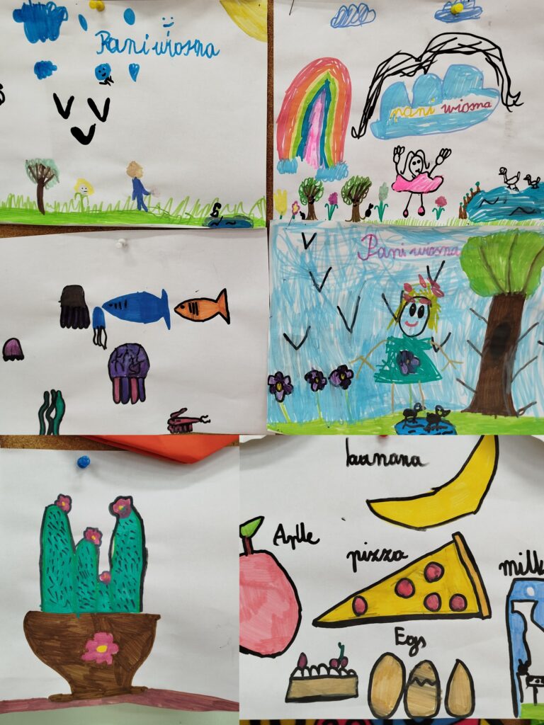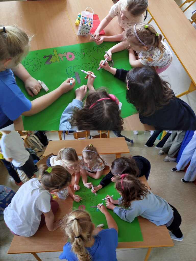 Rozmawialiśmy o zdrowym stylu życia, a na podsumowanie zajęć dzieci wykonały kolorowe „talerzyki” z ulubionymi smakołykami. Stworzyliśmy również wspólnie duży plakat „Żyj zdrowo na sportowo” który ozdobił szkolny korytarz.