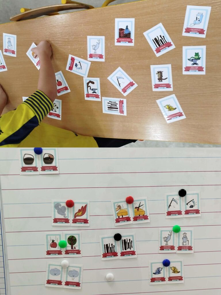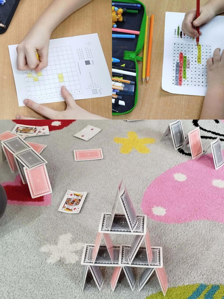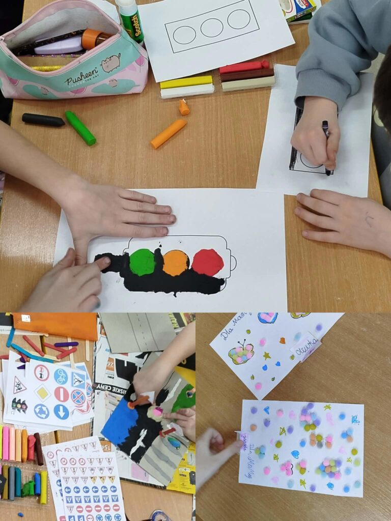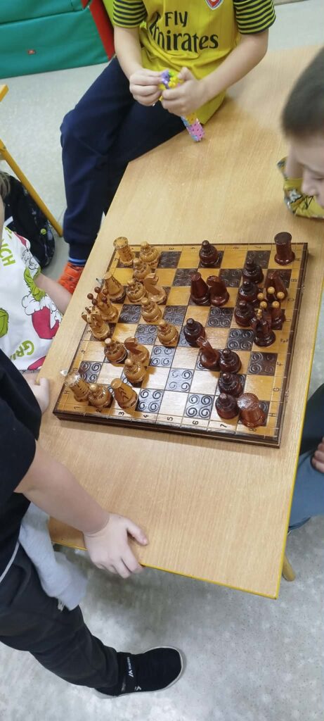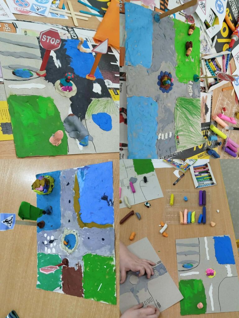 Rozmawialiśmy o tym jak unikać zagrożeń na lodzie, o sportach zimowych i zabawach na śniegu oraz obowiązku noszenia kasku. Dzieci poznały różne znaki drogowe, a każdy mógł wykonać własny sygnalizator świetlny. Na tekturowych platformach z plasteliny i drewnianych patyczków powstały „bezpieczne miasteczka” z ulicami, chodnikami, światłami oraz przejściem dla pieszych – było kreatywnie i kolorowo Omawialiśmy tradycyjne powiedzenia, dzieci łączyły je w pary, a wspólne rozmowy i odgrywanie scenek sytuacyjnych pomogły zrozumieć ich znaczenie. Były piosenki o Pani Zimie, rozegrano kilka partii szachów – gdzie dzieci wykazały się sporą wiedzą oraz grupowe gry strategiczne dostosowane do ich zainteresowań.