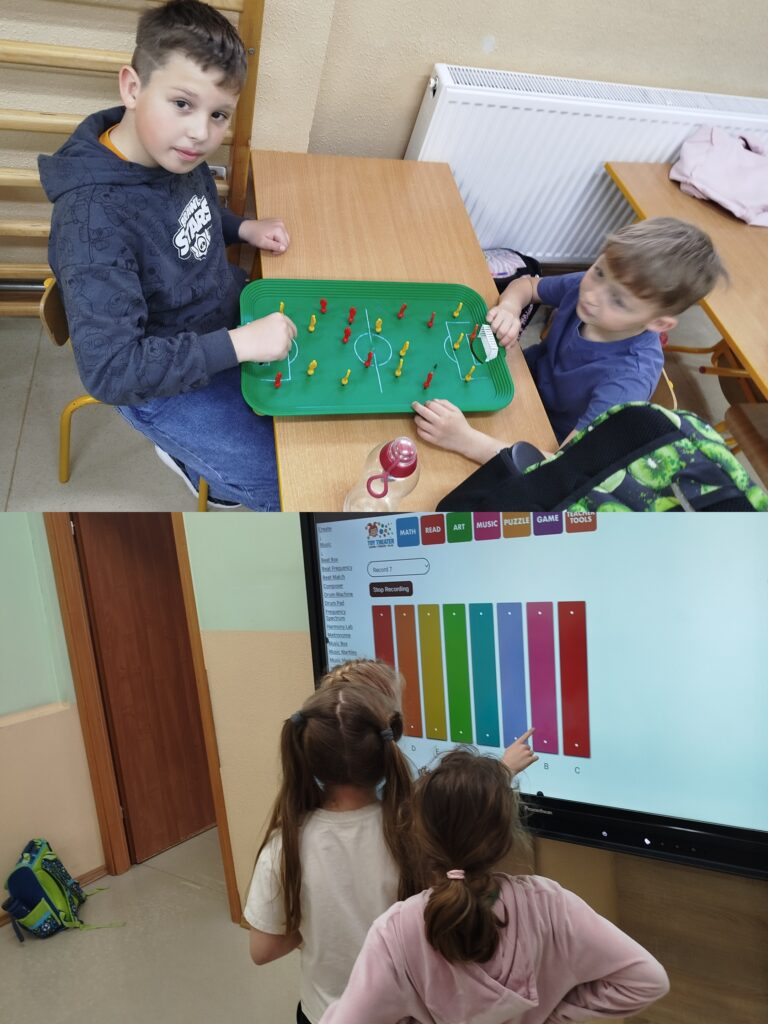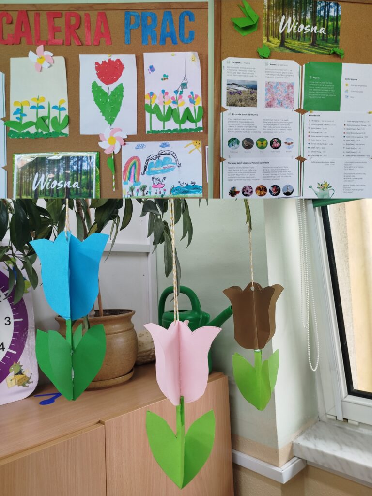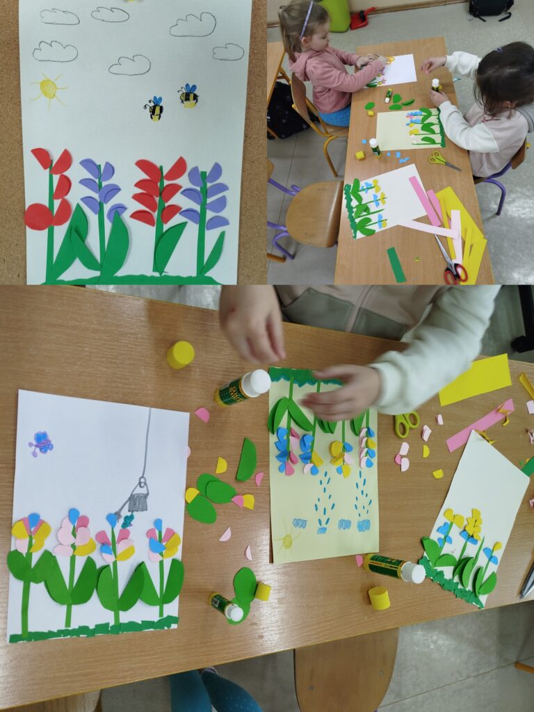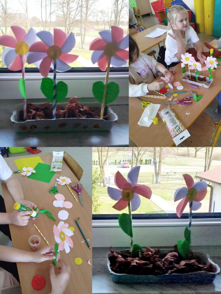 Powstały prace „tęczowa łąka” oraz doniczki z recyklingu, w których sadziliśmy papierowe kwiaty by do naszej sali zawitał wiosenny nastrój. Nie zabrakło też czasu na zabawę swobodną oraz edukacyjne gry i łamigłówki również na tablicy interaktywnej.