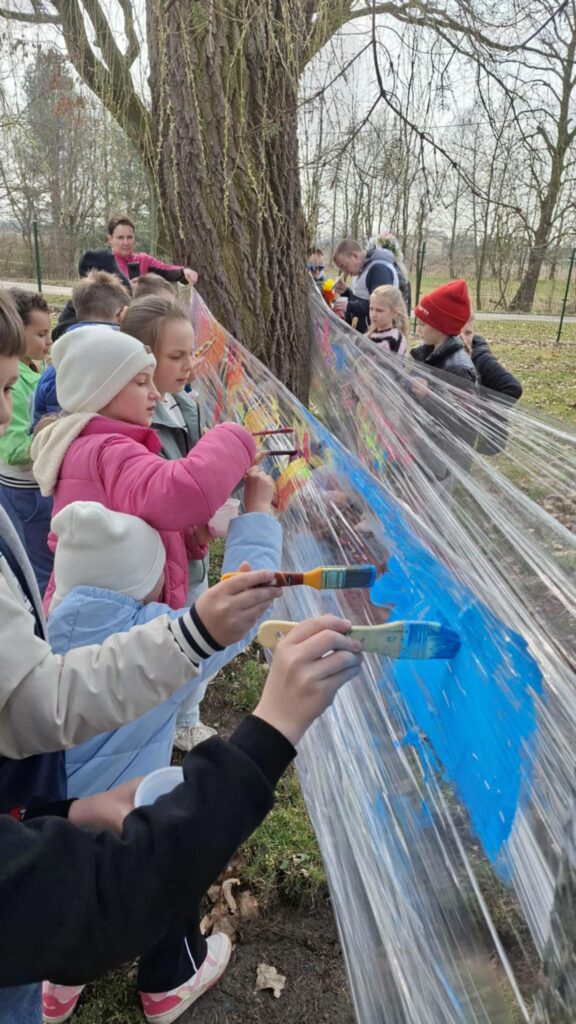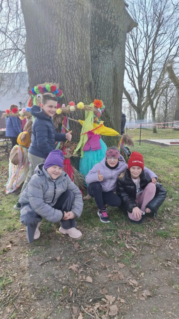 Wizyta upłynęła w niezwykle ciepłej i radosnej atmosferze – przy ciepłej herbacie, słodkim poczęstunku i dźwiękach muzyki uczniowie chętnie angażowali się w przygotowane atrakcje.  Były zabawy ruchowe, malowanie na folii, zabawy przy muzyce, ognisko i na koniec palenie kukieł, co ma nam zapewnić nadejście wiosny.